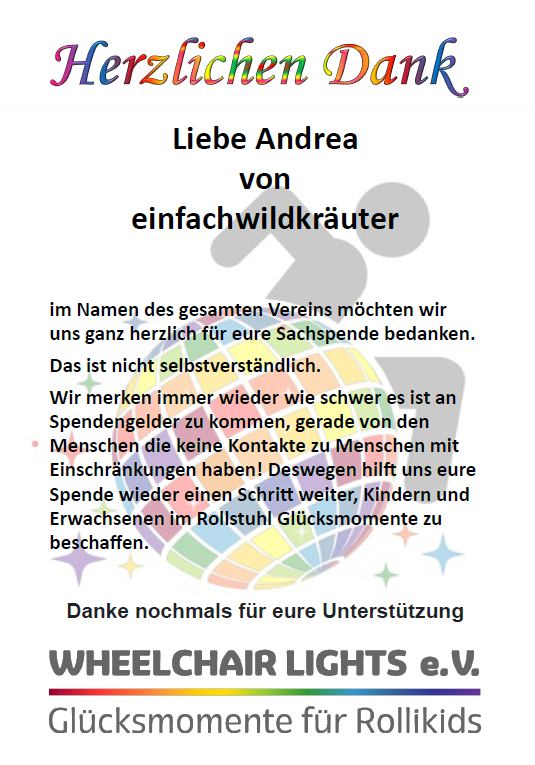 Ich habe dann noch die Spendensumme mit 75,00 € auf die 400,00 € aufgestockt. Diese 75,00 € sind auch den Wheelchairlights e.V. geflossen.